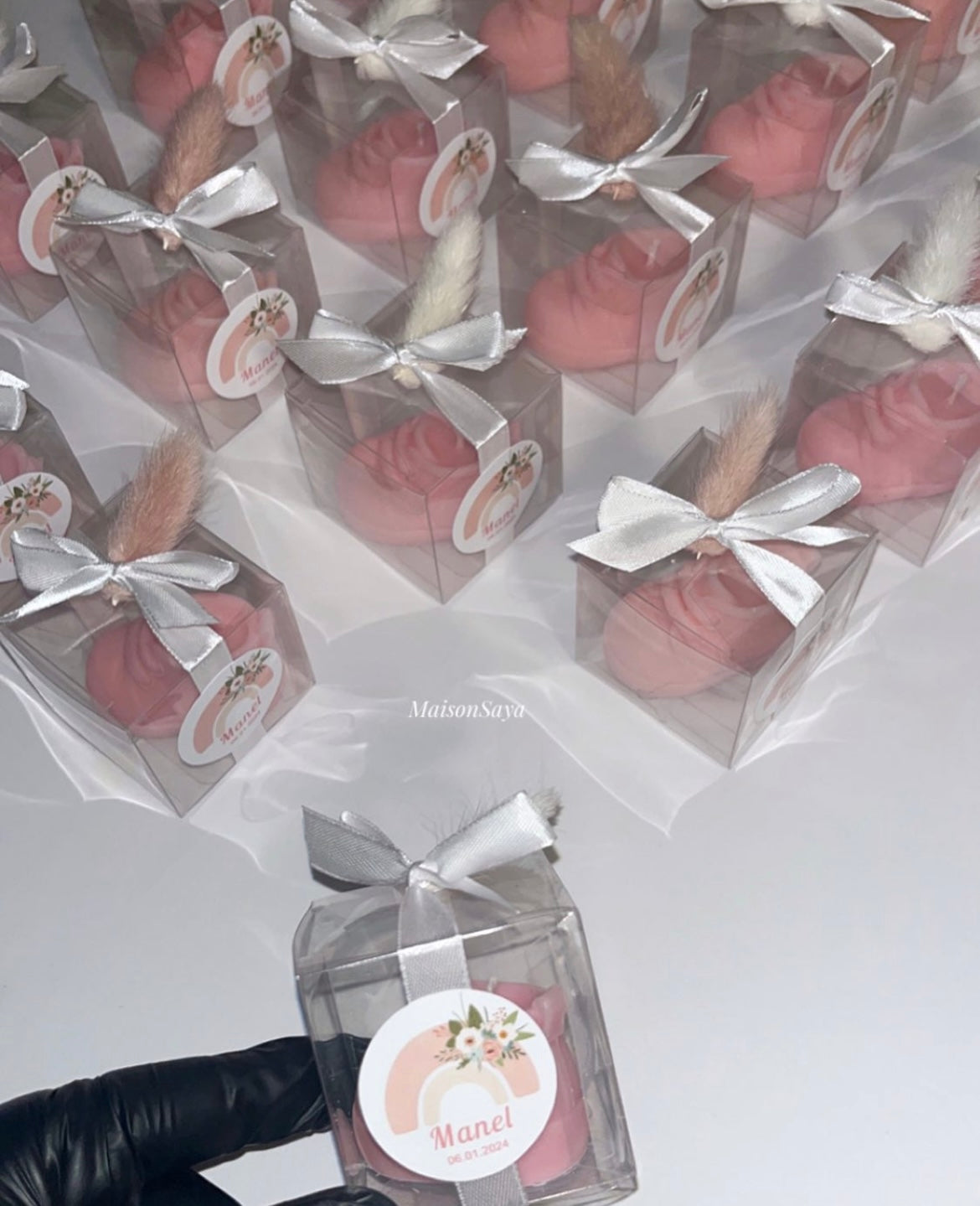 Le prix de la bougie inclus, la bougie, l'emballage, le ruban, l'étiquette ainsi que la pampa (possibilité de ne pas la mettre).