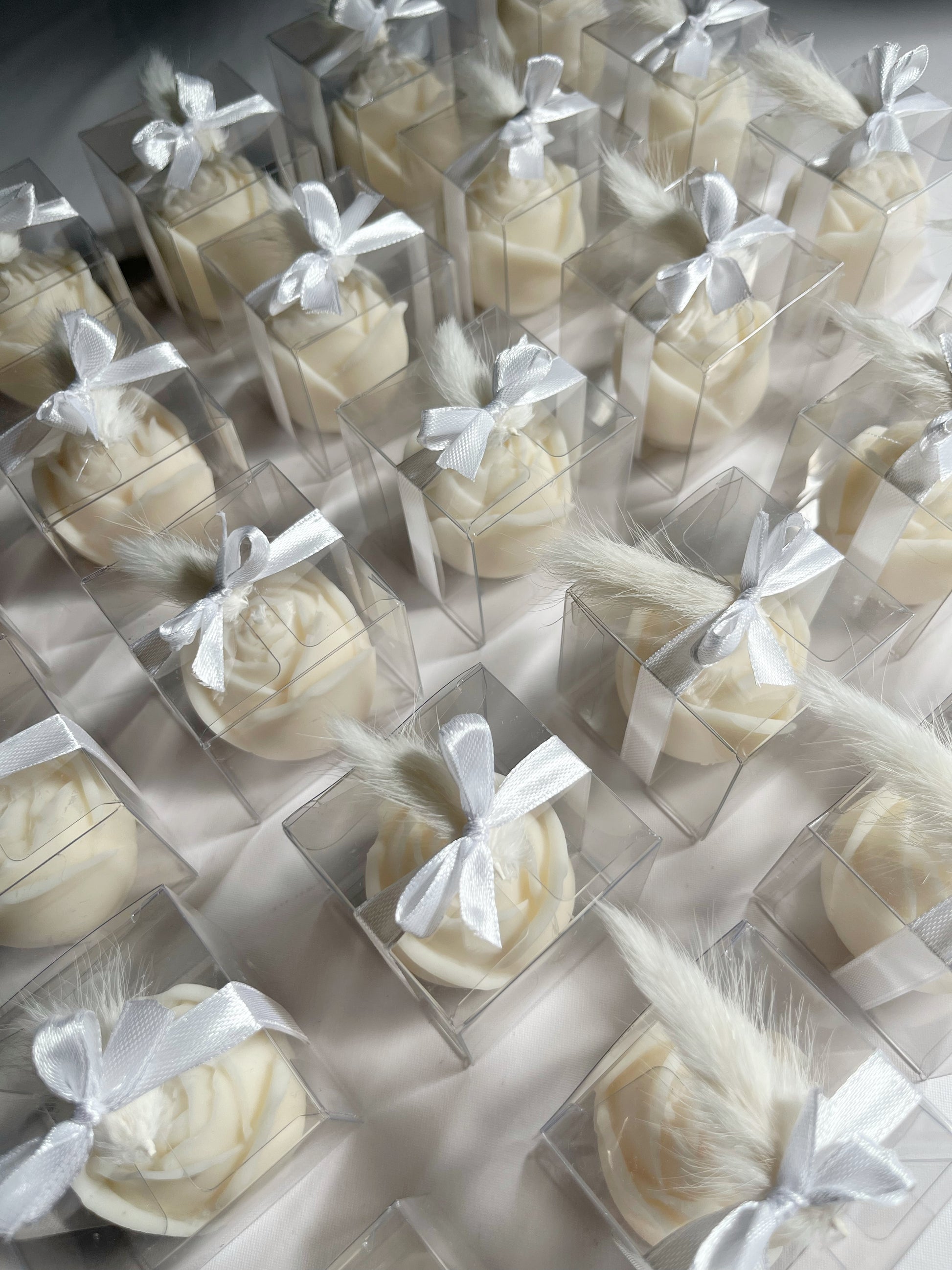 Des roses en forme de bougies pour célébrer votre heureux événement, apportant une touche d'émotion à vos invités. Les bougies peuvent être colorées selon vos préférences, et les rubans sont entièrement personnalisables.