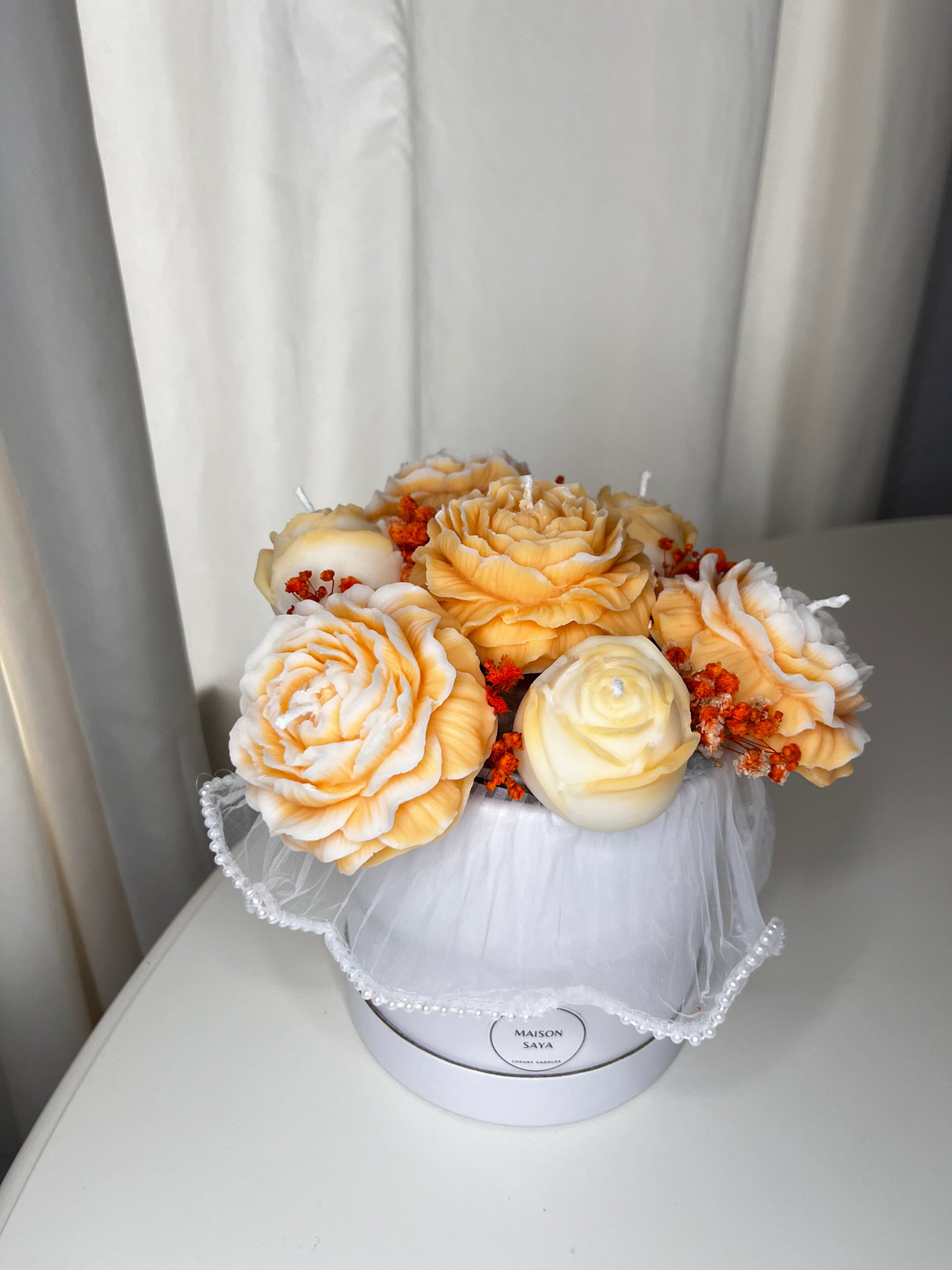Un délicat assemblage de fleurs sculptées à la main, aux teintes pêche et ivoire, reposant dans une élégante boîte Maison Saya. Une création raffinée qui mêle douceur, poésie et savoir-faire artisanal.